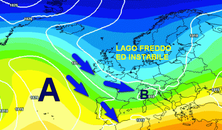 L’alta pressione, come anticipato, uscirà dalla scena Mediterranea, migrando in direzione del vicino Atlantico. Di rimando, correnti fredde ed instabili da nord-ovest scorreranno sui settori occidentali del Continente, attivando depressioni e tempo instabile sull’Italia.