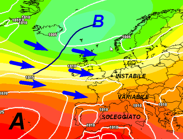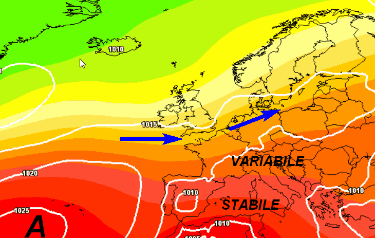 Con le frecce blu abbiamo indicato il flusso relativamente fresco ed instabile proveniente dall’Atlantico che raggiungerà il settentrione determinando condizioni di variabilità con rischio di temporali. Al centro, sulle Isole e al sud prevarrà il tempo stabile ed anche caldo, ma senza il raggiungimento di punte termiche eccessive.