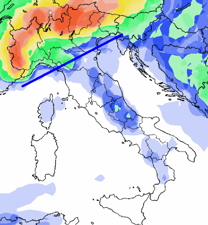 A nord della linea blu, la probabilità di pioggia sarà compresa tra MEDIA ed ELEVATA, con i valori più intensi in prossimità di Alpi e Prealpi. Sul resto d’Italia la medesima probabilità sarà BASSA o NULLA, segno della maggiore presenza dell’alta pressione.