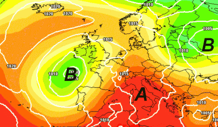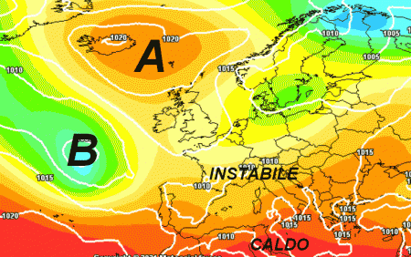 Cosa notiamo? Due aree di alta pressione: la prima in sede islandese, la seconda sul nord Africa (anticiclone africano). In mezzo si dipartirà un canale blandamente depressionario con tempo instabile (ovvero inaffidabile) al nord e al centro. Su queste regioni il rischio di avere temporali sarà più che concreto, sotto l’egida di temperature gradevoli se non addirittura fresche sotto eventuali rovesci.