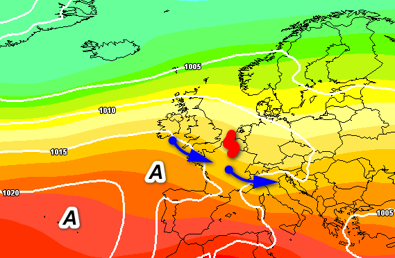 Ecco la “crisi” dell’alta pressione che si farà sorprendere dalle correnti fresche ed instabili di matrice atlantica (frecce blu). In altre parole, al nord e su parte delle regioni centrali potrebbero tornare rovesci e temporali in un contesto termico non particolarmente caldo. Sul resto d’Italia avremo invece condizioni meteo decisamente migliori e temperature più inclini alla stagione estiva.