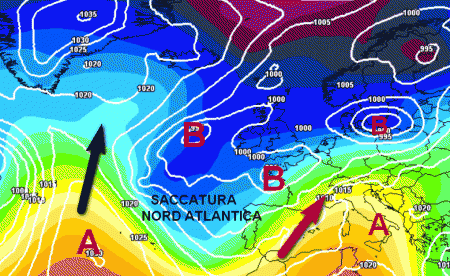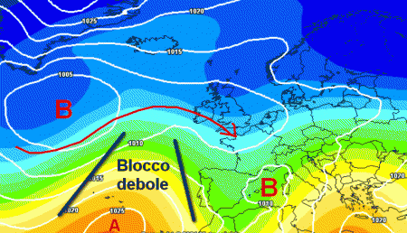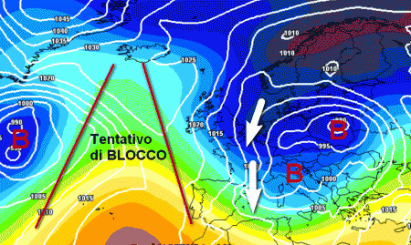 E’ palese che rispetto alla mappa sopra, il blocco in Atlantico risulterebbe debole e poco intrusivo nei confronti delle miti correnti oceaniche. Così facendo, non si interromperebbe il collegamento con l’oceano (freccia rossa ricurva) ed il freddo farebbe molta più fatica ad arrivare in Italia.