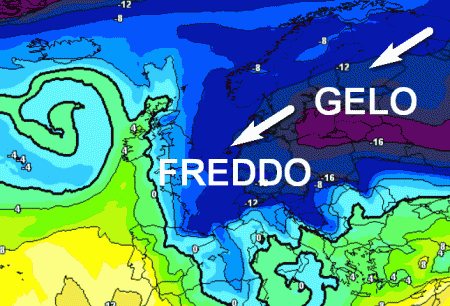 Ecco il maltempo sull’Italia indotto dalla figura perturbata precedente, ormai traslata verso levante. Non fatevi ingannare dai colori in quanto il clima sarà solo moderatamente freddo specie al centro-nord dove la neve potrebbe scendere anche a bassa quota.