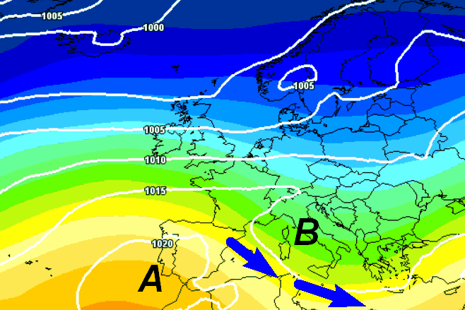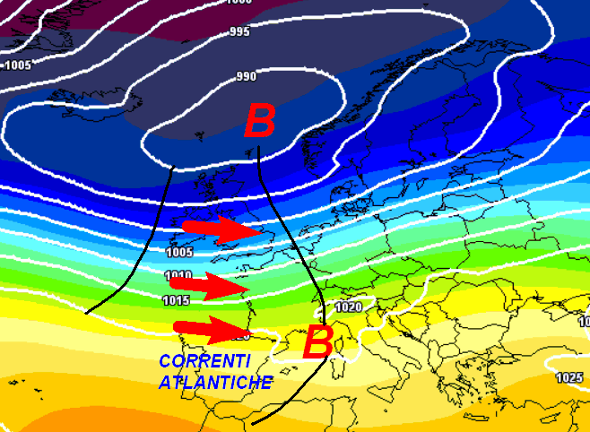 Le correnti perturbate atlantiche potrebbero far piegare la testa all’alta pressione; in Italia si avrebbero quindi alcuni passaggi piovosi in un contesto inizialmente non freddo.