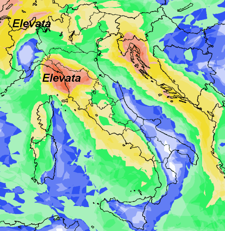 Molte zone italiane avranno una probabilità media o elevata di veder piovere (o nevicare sulle Alpi). Dove vedete il colore tendente al blu, la medesima probabilità viene invece (al momento) giudicata bassa.