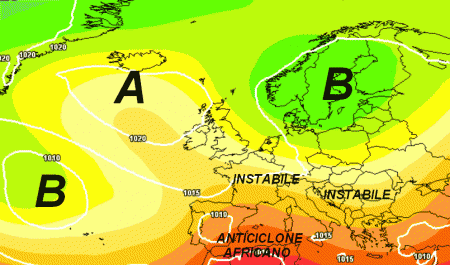 Notiamo la posizione un po’ anomala dell’alta pressione atlantica, disposta con un massimo poco a sud dell’Islanda, oltre ad un anticlone africano molto debole che spunta con la sua pericolosa gobba dal nord Africa.