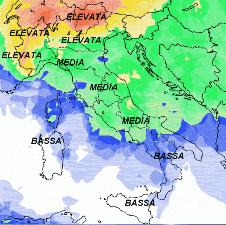 Ecco le regioni centro-settentrionali e parte di quelle meridionali sotto una probabilità di pioggia MEDIA che asseconda il profilo instabile dell’atmosfera. Sulle Alpi e le alte pianure la medesima probabilità potrebbe essere addirittura ELEVATA. Più BASSA invece dove l’alta pressione si farà sentire, ovvero sulle Isole e gran parte delle regioni meridionali.