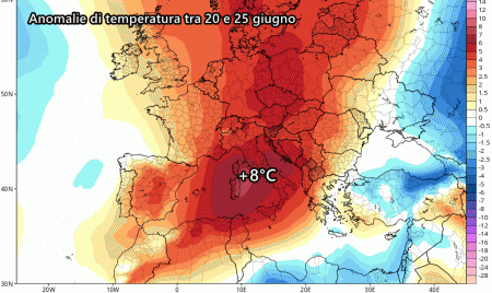 Il caldo sarà più marcato al sud e sulle isole maggiori, ma l’anomalia termica, in fin dei conti, sarà presente praticamente su tutto lo Stivale e potrebbe raggiungere anche 8°C di anomalia termica rispetto alla media stagionale, su un arco temporale di ben 5 giorni. Tra 20 e 25 Giugno le temperature saranno molto al di sopra della media del periodo, su tutta Italia. Ci sarà un breve intermezzo temporalesco, sempre più probabile il 23 Giugno, ma non influirà molto sulle temperature.