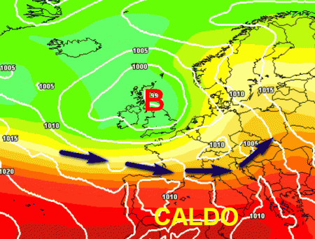 Si notano molto bene i due contendenti sopra citati: l’alta pressione africana che agirà alle basse latitudini del Mediterraneo e le correnti più fresche ed instabili atlantiche che impegneranno il nord e parte del centro con qualche temporale. Al sud e sulla Sicilia il tempo sarà più stabile e caldo stante la maggiore vicinanza all’anticiclone medesimo.
