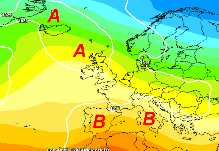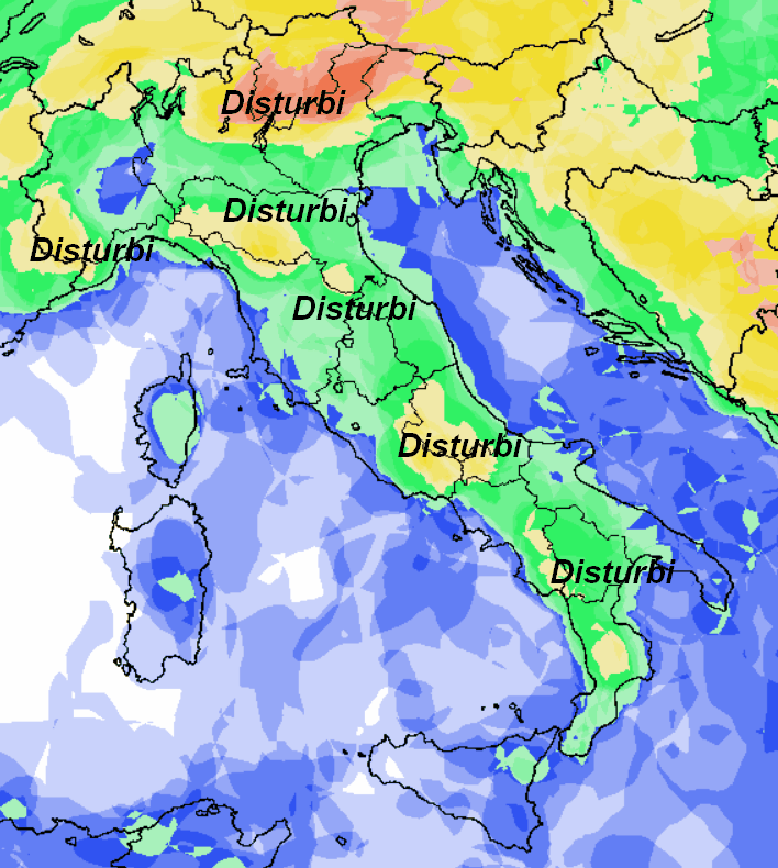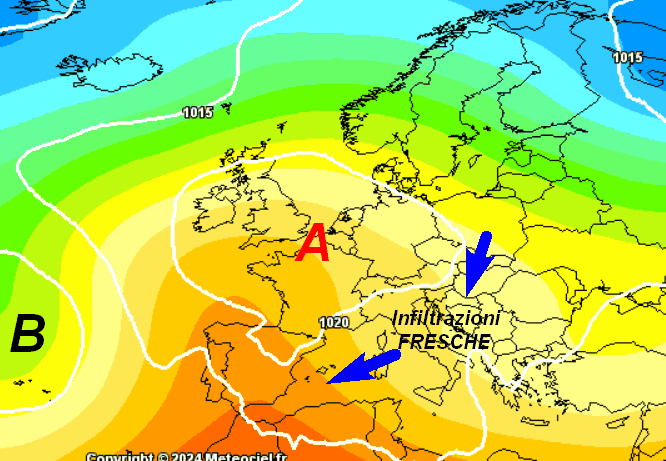 La grossa area perturbata sull’Europa centro-occidentale dovrebbe lasciare spazio ad una figura opposta, ovvero un’alta pressione con centro tra le Isole Britanniche e la Francia…un po’ troppo sbilanciata a nord-ovest per interessare a pieno la nostra Penisola. Come si evince dalla cartina, l’Italia sembra restare sotto il tiro di correnti fresche ed un po’ instabili, che combinate con la radiazione solare ormai efficace, potrebbero determinare annuvolamenti nelle aree interne e montuose, localmente associati a rovesci o temporali pomeridiano-serali.