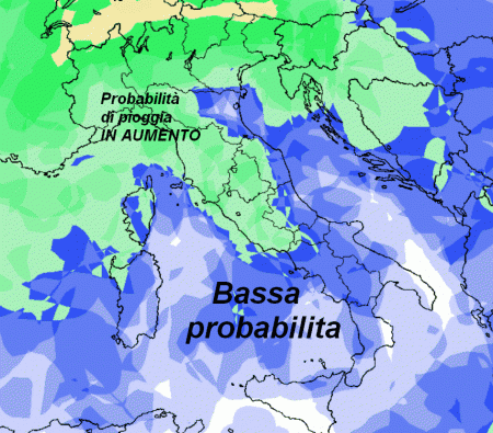 Probabilità di pioggia in aumento al nord e sulle regioni del versante tirrenico; ancora bassa la medesima probabilità sulle altre regioni dove l’anticiclone potrebbe insistere maggiormente.