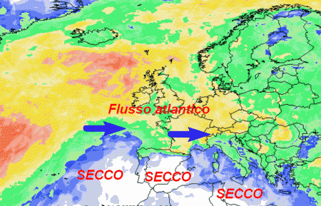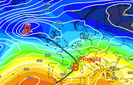 Previa l’azione disturbante del solito anticiclone in basso a sinistra, la perturbazione dovrebbe farcela ad arrivare sull’Italia, portando piogge anche nelle aree più bisognose del settentrione.
