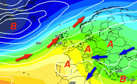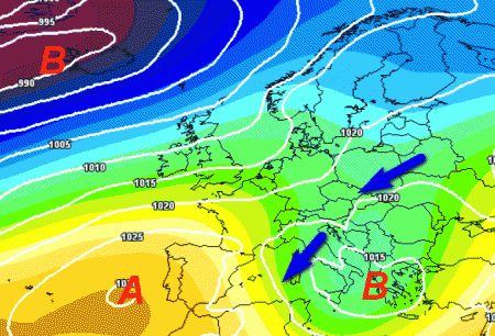 Sul bordo meridionale dell’alta pressione potrebbe scorrere aria fredda di matrice orientale che verrebbe messa in moto da una depressione posta in sede ellenica.