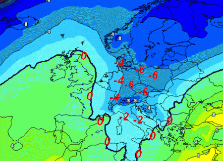 In buona sostanza, tutta l’italia verrebbe abbracciata da isoterme alla medesima quota quasi ovunque inferiori allo zero, con punte al ribasso fino a -4/-6° a 1500 metri in prossimità dell’arco alpino.