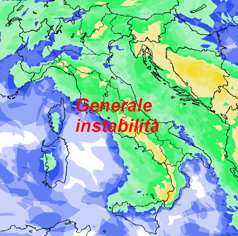 Come potete vedere, solo la Sardegna, parte della Sicilia e del nord-ovest avranno una probabilità di pioggia bassa. Sul resto d’Italia vigerà una probabilità di pioggia media o medio-alta laddove vedete il colore giallo.