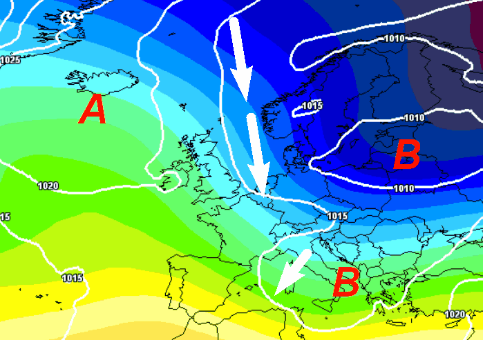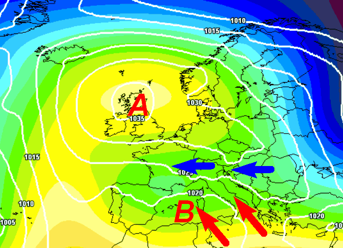 Finalmente un cambiamento! Ecco l’alta pressione che si espanderà sul nord Europa dando vita a correnti fredde orientali sulla nostra Penisola (frecce blu). Tali correnti potrebbero poi contrastare con aria più mite di provenienza africana dando luogo ad instabilità sul Mediterraneo con nevicate anche a bassa quota su parte delle regioni centrali e al nord.