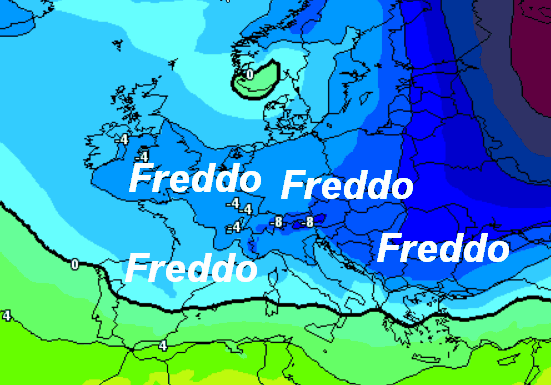 Isoterme alla medesima quota comprese tra -4 e -6° sulle regioni settentrionali; tra -2 e -4° su gran parte del centro e tra 0° e + 2° al meridione e sulle Isole. Il freddo sarà presente anche su quasi tutto il nostro Continente, ad eccezione delle basse latitudini del Mediterraneo.