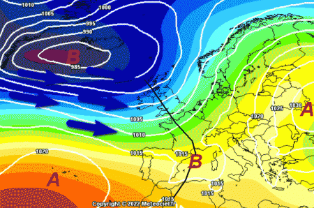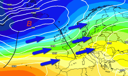 Si abbasserà finalmente di latitudine l’alta pressione, garantendo al flusso umido atlantico una penetrazione migliore sulla nostra Penisola e sul Mediterraneo. Notate inoltre le correnti oceaniche (frecce blu) come arriveranno spedite sull’Europa occidentale e con loro tutte le perturbazioni. La zona di alta pressione posta più ad est frenerà un po’ il moto dei fronti verso nord-est garantendo una maggiore insistenza delle precipitazioni in sede italica.