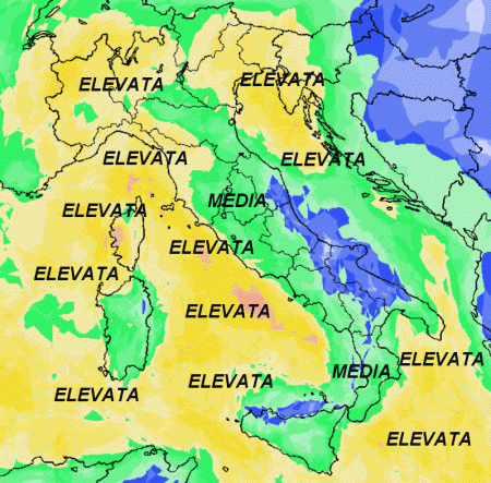 Molte aree avranno una probabilità di pioggia ELEVATA o MEDIA. La probabilità BASSA, nelle aree a colore blu, sarà limitata ad una ristretta fascia della nostra Penisola, ovvero il medio e basso Adriatico, spesso in sottovento rispetto alle correnti occidentali portanti.