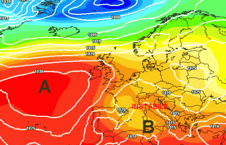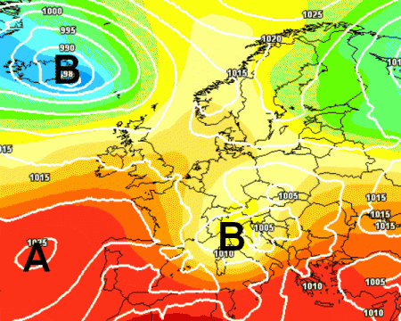 Alta pressione delle Azzorre forte in pieno Atlantico: sull’Europa centrale e l’Italia avremo invece la persistenza di un regime blandamente depressionario con rischio di temporali sparsi in un contesto termico gradevole.