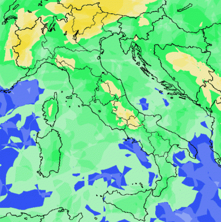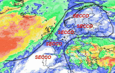 Il blocco secco presente più ad ovest e più a nord rappresenta la traccia della sopracitata alta pressione. Noi resteremo comunque esposti a correnti fresche orientali con un clima instabile, ovvero dettato da rovesci o temporali a macchia di leopardo sulla Penisola.