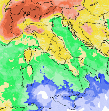 Probabilità di pioggia molto elevata al nord, elevata su gran parte del centro e le aree interne del meridione, media sulle altre aree ad eccezione della Sicilia che avrà una probabilità bassa.