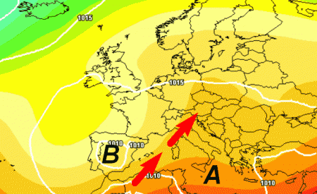 Alta pressione delle Azzorre che, puntando a nord, tenderà a congiungersi con una sorta di ponte ad un altro massimo pressorio in prossimità della Scandinavia. Questa mossa tenderà ad isolare una circolazione di bassa pressione sull’Italia e buona parte dell’Europa centrale foriera di tempo instabile o perturbato in loco.