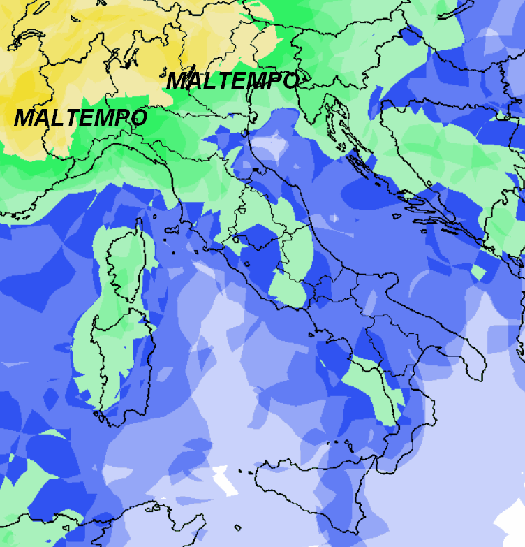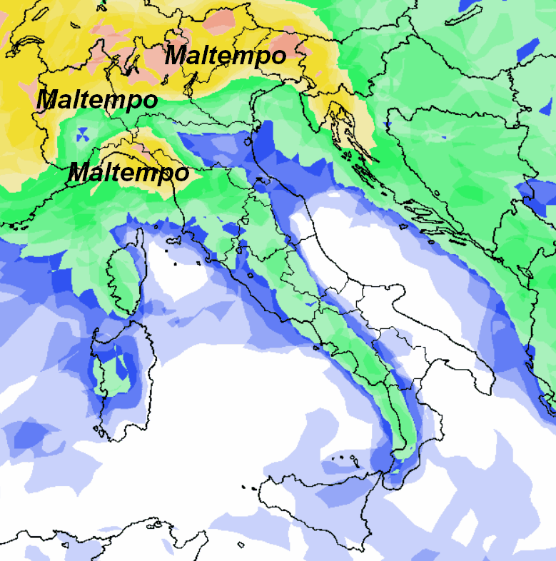 Probabilità di pioggia medio-alta su diversi settori dell’Italia settentrionale dove avremo quindi condizioni di maltempo. Un po’ di pioggia cadrà anche lungo il Tirreno e parte della Sardegna (probabilità media), per il resto avremo una probabilità bassa o nulla dove vedete il colore bianco sulla cartina.