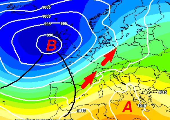 Ecco la vasta depressione centrata in prossimità del Regno Unito che disporrà un ventaglio di correnti umide ed instabili anche sull’Italia, segnatamente al nord e al centro. Una relativa zona di alta pressione si stabilirà invece al sud dove avremo condizioni meteorologiche decisamente migliori.