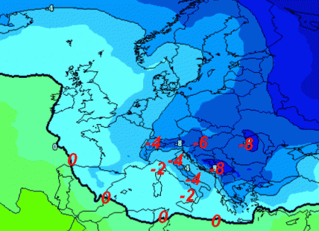 Le correnti fredde da nord-est spediranno l’isoterma 0° a 1500 metri fin sul nord Africa! Ad incalzare subito dietro isoterme di -2/-3° sulla Penisola ed addirittura -4° sulle Alpi e lungo il versante adriatico, con una punta di -8° sul vicino est europeo.