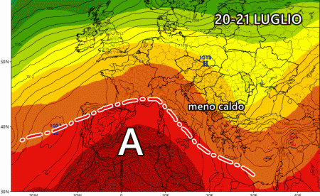 Una piccola pausa potrebbe concretizzarsi attorno al 20-21 Luglio, o per meglio dire potrebbe esserci una momentanea riduzione del caldo. Secondo il modello americano GFS l’anticiclone potrebbe indietreggiare, allontanando di fatto i nuclei più caldi sub-tropicali dall’Italia.