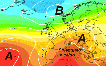 Ecco il promontorio di alta pressione centrato proprio sull’Italia, foriero di bel tempo e caldo estivo praticamente da nord a sud. Le correnti fresche settentrionali si saranno portate sull’Europa orientale, mentre il flusso atlantico "cadrà" leggermente ad ovest con una saccatura sulla Penisola Iberica, con poche velleità di avanzamento verso di noi.