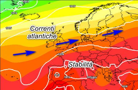 L’alta pressione dovrebbe prendere nuovamente possesso dell’Italia e del bacino del Mediterraneo. Notate le correnti occidentali che torneranno a scorrere a latitudini molto elevate, lambendo di tanto in tanto solo le Alpi.