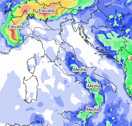 Temporali di stagione possibili lungo le Alpi, a tratti anche sulle alte pianure e sull’Appennino centro-meridionale. Sulle restanti zone la probabilità di pioggia sarà bassa o nulla (dove vedete il colore bianco).