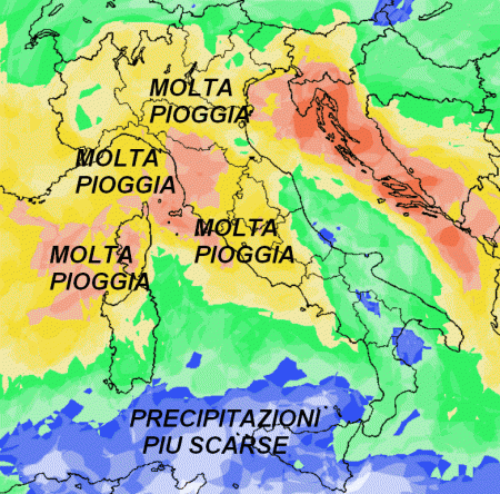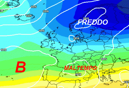 L’alta pressione delle Azzorre verrà spodestata dal luogo di origine ed al suo posto campeggerà una vasta depressione che invierà verso l’Italia correnti meridionali umide e piovose. Notate l’aria fredda in alto, che con moto anti-zonale (da est verso ovest) interesserà tutta l’Europa settentrionale e parte di quella centrale, alimentando la depressione suddetta.