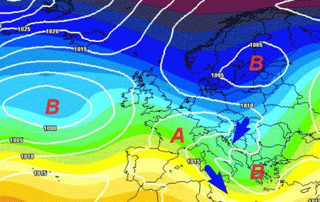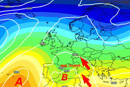 La saccatura indotta dalla prima perturbazione sarà già sulla Penisola Balcanica. Un corridoio temporaneo di aria fredda da nord-est (frecce blu) sarà offerto all’Italia con un generale calo delle temperature e gli ultimi fenomeni sulle regioni adriatiche e al meridione, ma in via di attenuazione.