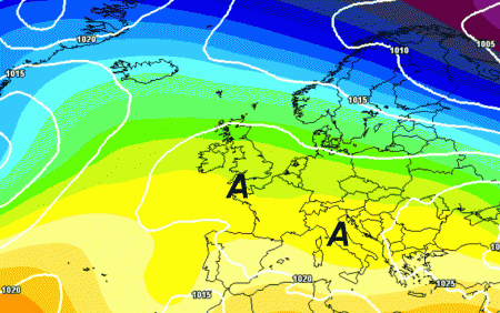 Rispetto alla mappa sopra, si evince uno sgonfiamento dell’alta pressione sotto la spinta di correnti atlantiche miti che inizieranno ad invadere il centro Europa con le prime piogge. Anche in Italia il tempo godrà di una maggiore variabilità in un contesto mite, con forse qualche piovasco sparso specie al nord e al centro.