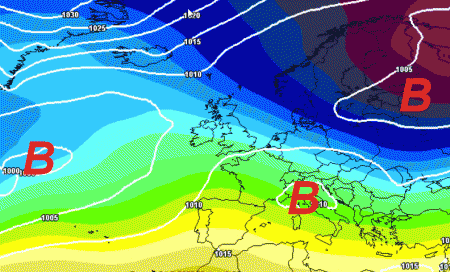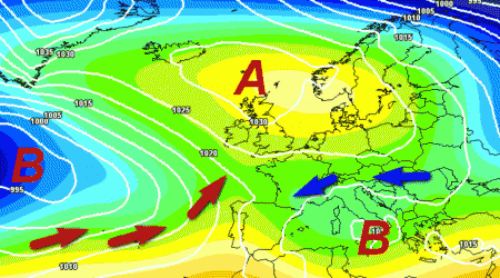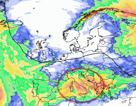 Alla luce di un massimo di alta pressione posizionato poco a nord della Scozia, sull’Europa meridionale e sull’Italia potrebbe andare in scena uno scontro di masse d’aria di diversa origine, con inevitabile maltempo da nord a sud.