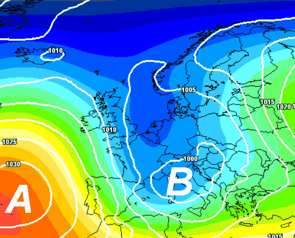Tempo instabile con rovesci e neve in montagna soprattutto al centro e al sud. Notate l’alta pressione che seguiterà a restare lontana dalla scena italiana, con un massimo situato poco al largo dell’Iberia.