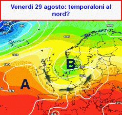 venerdì 29 agosto: forti temporali e crollo termico al nord con parziale coinvolgimento di Toscana, Umbria e nord Marche, sul resto del centro passaggi nuvolosi ma asciutto con lieve calo termico, al sud ancora bello e caldo.
