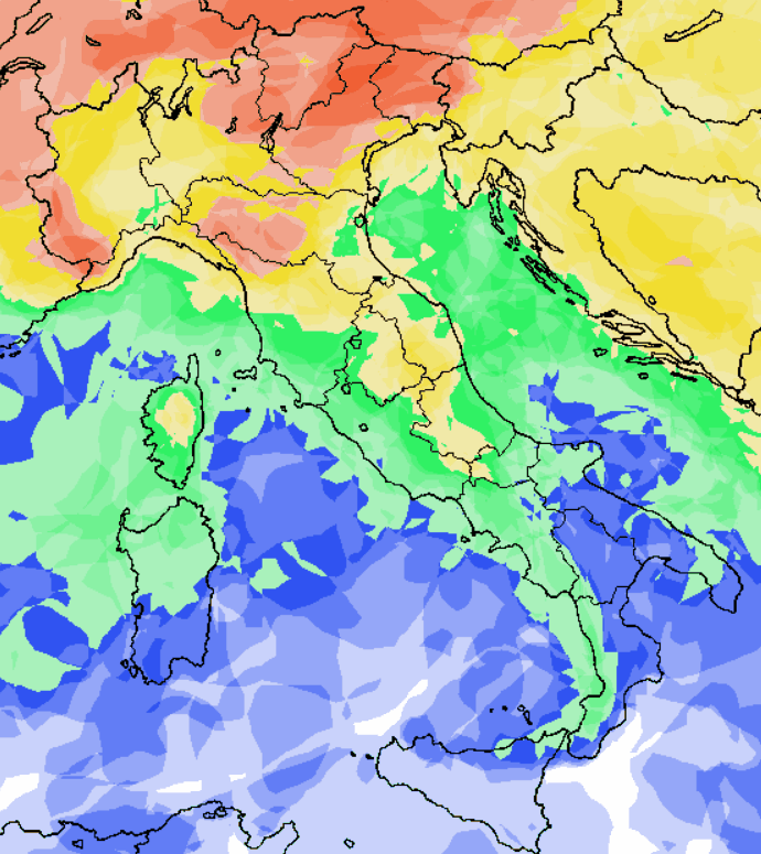 Come si evince da questa mappa, le regioni settentrionali oltre alle aree interne dell’Italia centrale verranno interessate da una probabilità di pioggia medio-alta o addirittura elevata dove vedete il colore rosso. Parte delle regioni meridionali e le Isole avranno invece una probabilità di pioggia più bassa, contrassegnata dal colore blu.