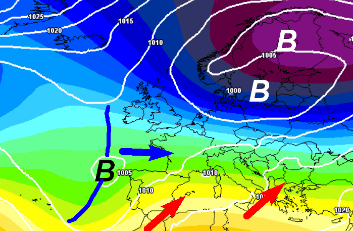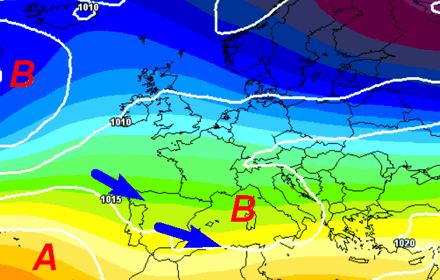 Dalla mappa si evince una situazione di “Atlantico basso”, ovvero senza l’alta pressione di spalla sulla Penisola Iberica a distorcere le correnti. In altre parole, le perturbazioni potrebbero scegliere la consueta via preferenziale da ovest verso est interessando il Mediterraneo e l’Italia con un tempo spesso piovoso (ed ovviamente nevoso in montagna).