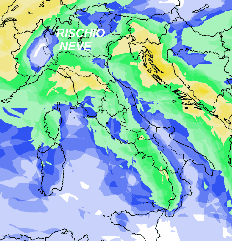 Le precipitazioni, in accordo con la siffatta sinottica occidentale, saranno maggiormente probabili sul Tirreno e gran parte delle regioni settentrionali. Abbiamo inoltre indicato il rischio di nevicate a bassa quota al nord, in accordo con le mappe termiche sopra esposte. Sul resto della Penisola le temperature saranno invece più elevate e di conseguenza la quota neve posta più in alto.