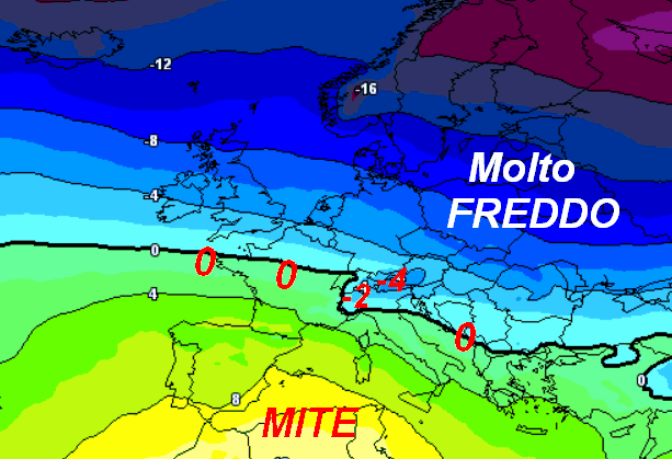 C’è però un fattore da tenere seriamente in considerazione. Il freddo non sarà allontanato completamente dal settore nord-orientale del Continente; parte di esso potrebbe seguitare a lambire le regioni settentrionali come mostra la mappa termica degli scenari a 1500 metri del modello americano valida sempre per mercoledi 17 gennaio: