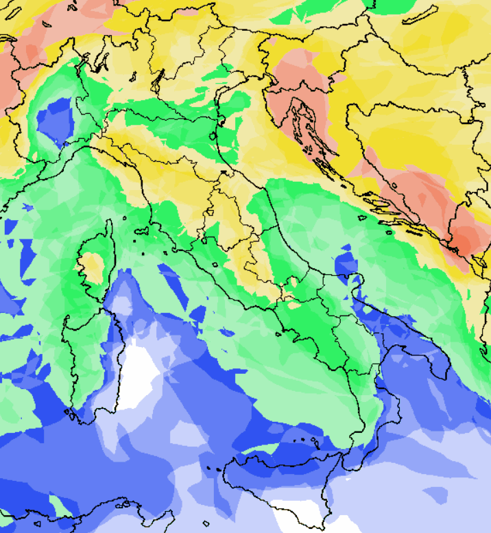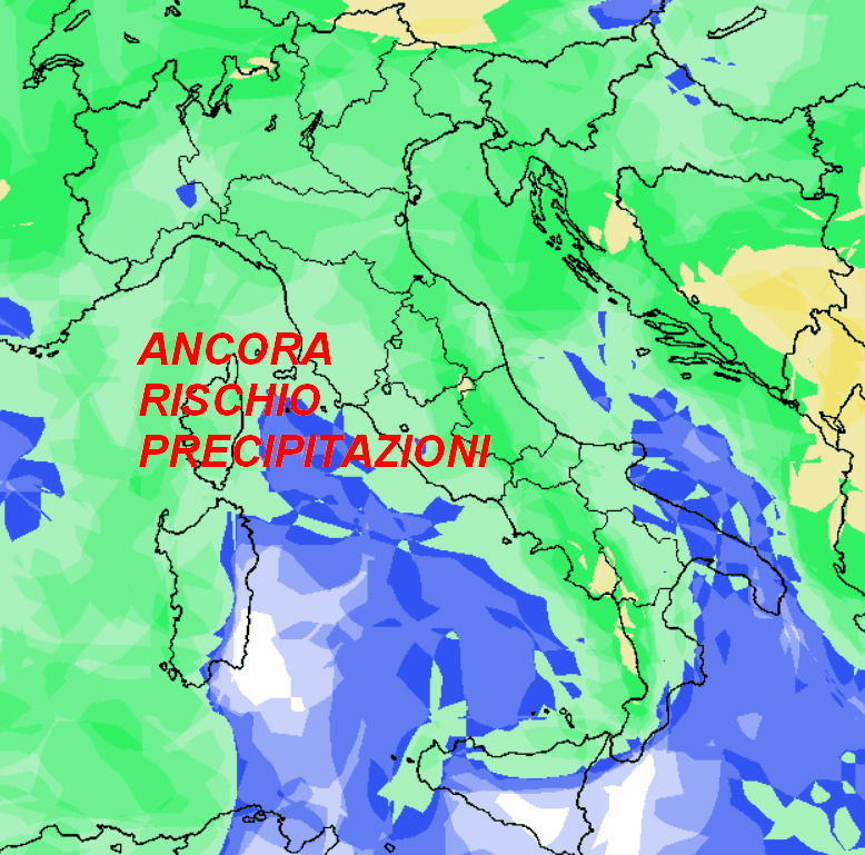 Come si evince dalla cartina, la possibilità di avere precipitazioni su gran parte della nostra Penisola seguiterà ad essere MEDIA, più BASSA solo nelle aree colorate in blu, il tutto sempre in un contesto nel complesso mite.