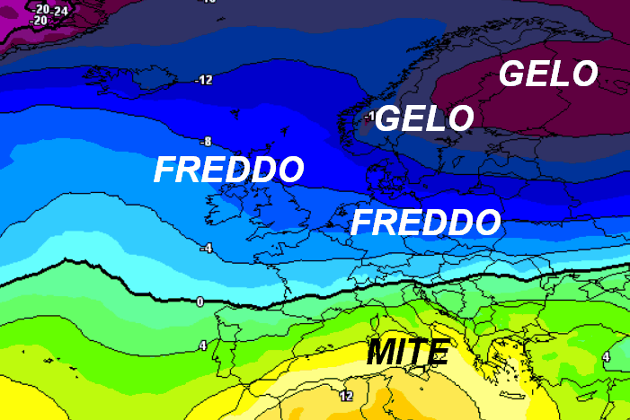 Si nota il grande freddo che abbraccerà soprattutto l’Europa settentrionale, dove avremo vere e proprie condizioni di gelo. A tutto ciò si contrapporrà un clima mite sul Mediterraneo e l’Italia.