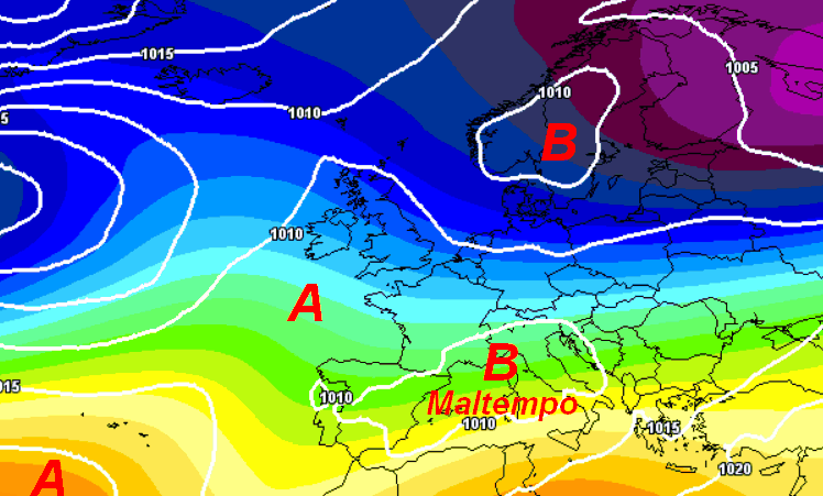 Notiamo una circolazione di bassa pressione sul Mediterraneo con associate condizioni di maltempo anche sull’Italia. In sostanza, vi saranno piogge su molte regioni italiane, ma in un contesto termico piuttosto mite anche se qualche piccola sorpresa più fredda al nord potrebbe esserci.
