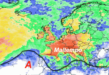 Guardate quanta pioggia potrebbe riversarsi sull’Europa centrale e le regioni centro-settentrionali italiane, in accordo con una vasta saccatura di matrice nord atlantica che ingloberà gran parte del nostro Continente. L’alta pressione si manterrà lontana dall’Italia ed invierà pigramente un cuneo in direzione dell’Atlantico Portoghese, senza interessarci.