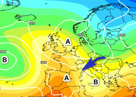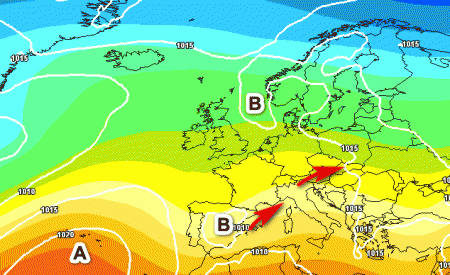 Quella che vedete è la fase finale del "guasto" che terrà sotto scacco gran parte del nostro Paese tra la fine di aprile ed il Primo Maggio. Qui si nota una depressione al sud, correnti fresche da nord-est e una vasta zona di alta pressione sui meridiani centrali del Continente. Sarebbe, in sostanza, una situazione instabile, ma non per tutti.