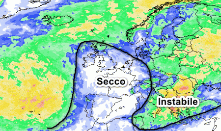 Ecco la zona secca, corrispondente all’alta pressione sull’Europa occidentale e parte del centro-nord della Penisola, dove la probabilità di pioggia viene giudicata bassa. Più ad est si nota invece il flusso instabile che interessa l’Europa orientale e di rimando anche il centro-sud della Penisola, con piogge e temporali in un contesto termico non caldo. Qui la probabilità di pioggia viene giudicata più elevata.